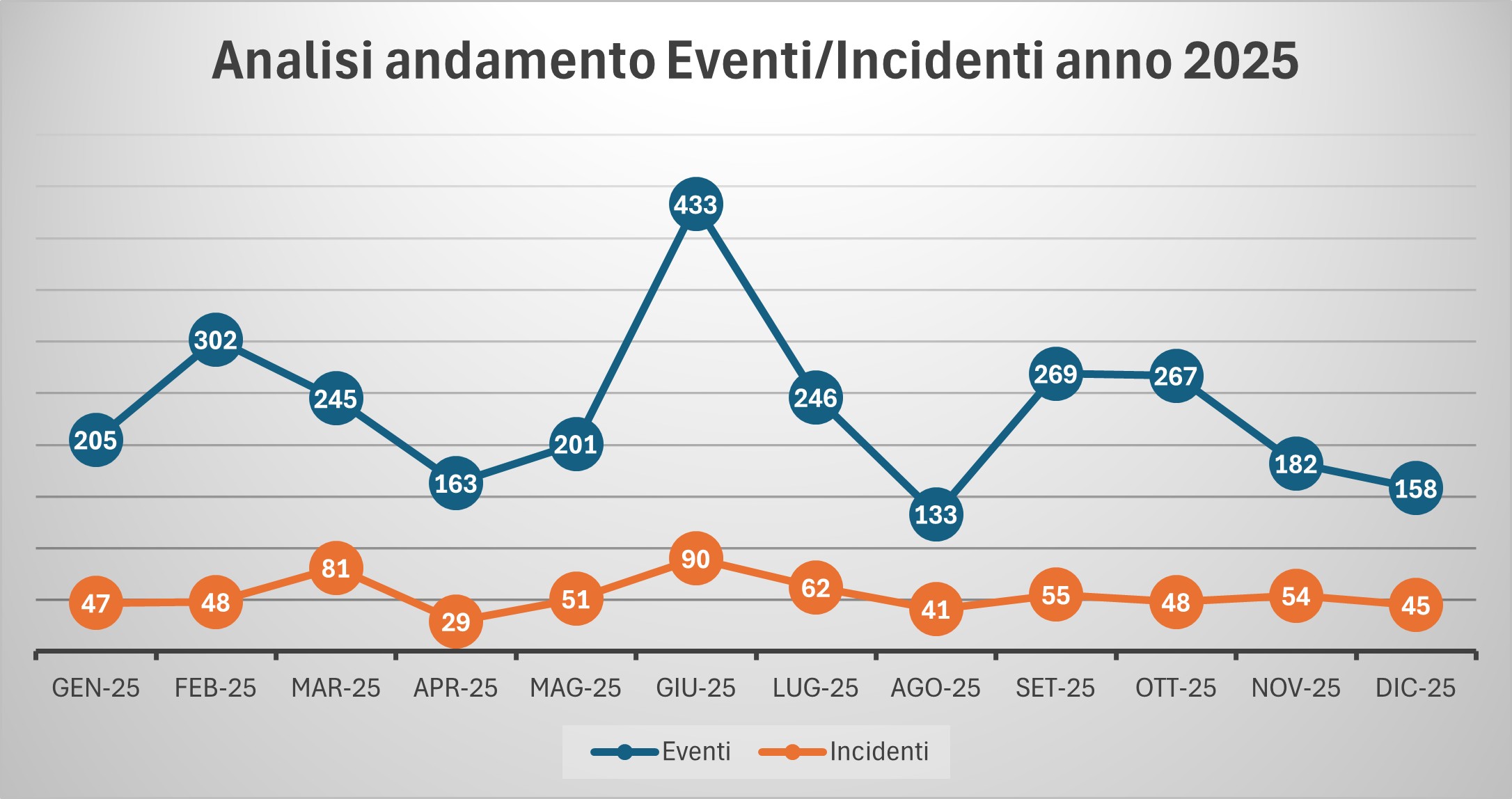 Se osserviamo i dati, vediamo come il cosiddetto "tasso di incidentalizzazione", ovvero il numero di eventi che si trasformano in incidenti nel 2025 è pari al 23%, ovvero meno di un quarto degli eventi si trasforma in un incidente confermato. Tuttavia, il dato analitico per singolo mese e semestre, evidenzia una tendenza peggiorativa. Infatti, se nel primo semestre tale percentuale era di circa il 22%, nel secondo semestre questa percentuale sale a poco più del 24%.