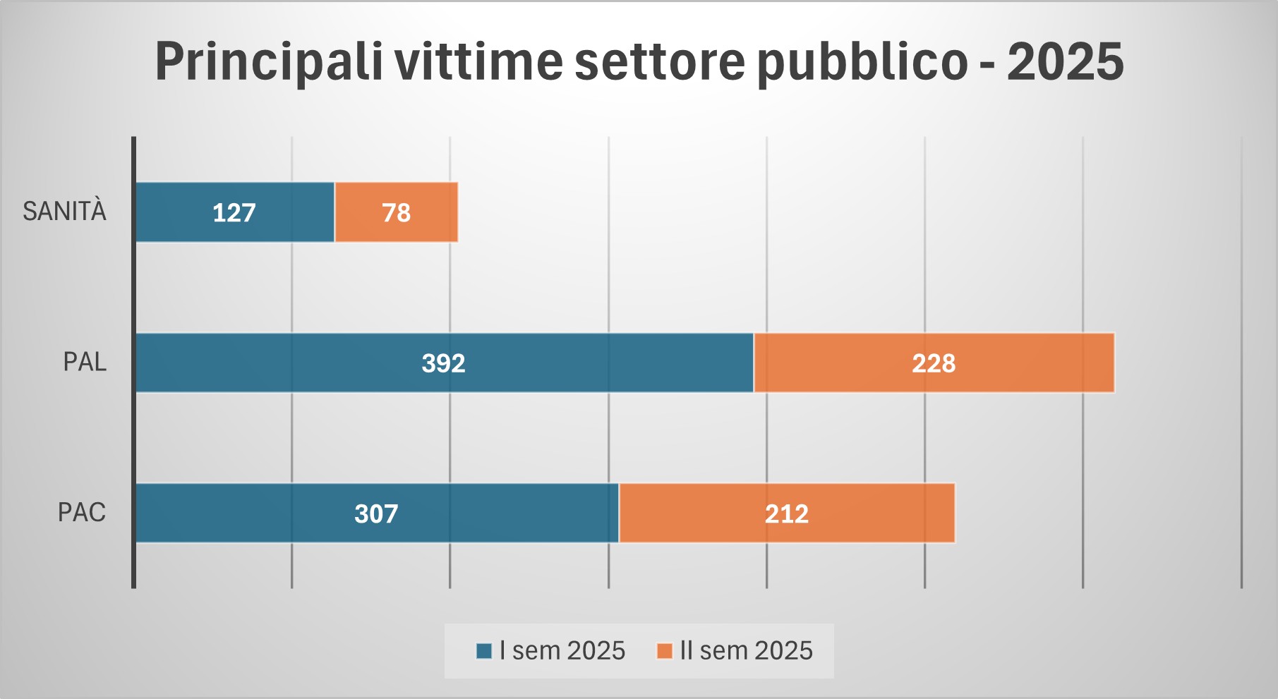 Il maggior numero di vittime di eventi è stato registrato nei settori della Pubblica amministrazione (centrale e locale) e nel comparto sanità. La figura che segue illustra la suddivisione gli andamenti nei due semestri del 2025.